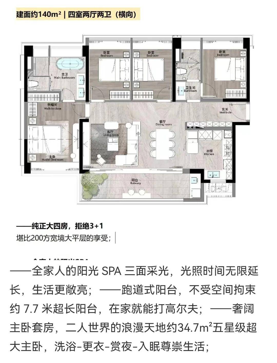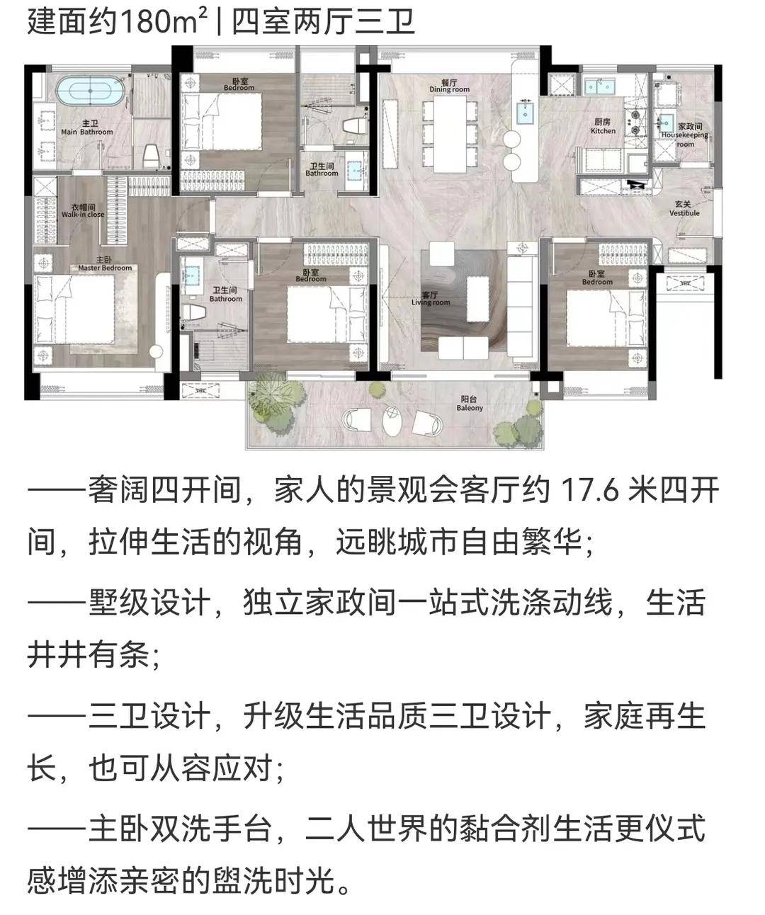 【建面约180㎡四房】三卫设计,独立主人起居区,配备步入式衣帽间与观景浴缸
