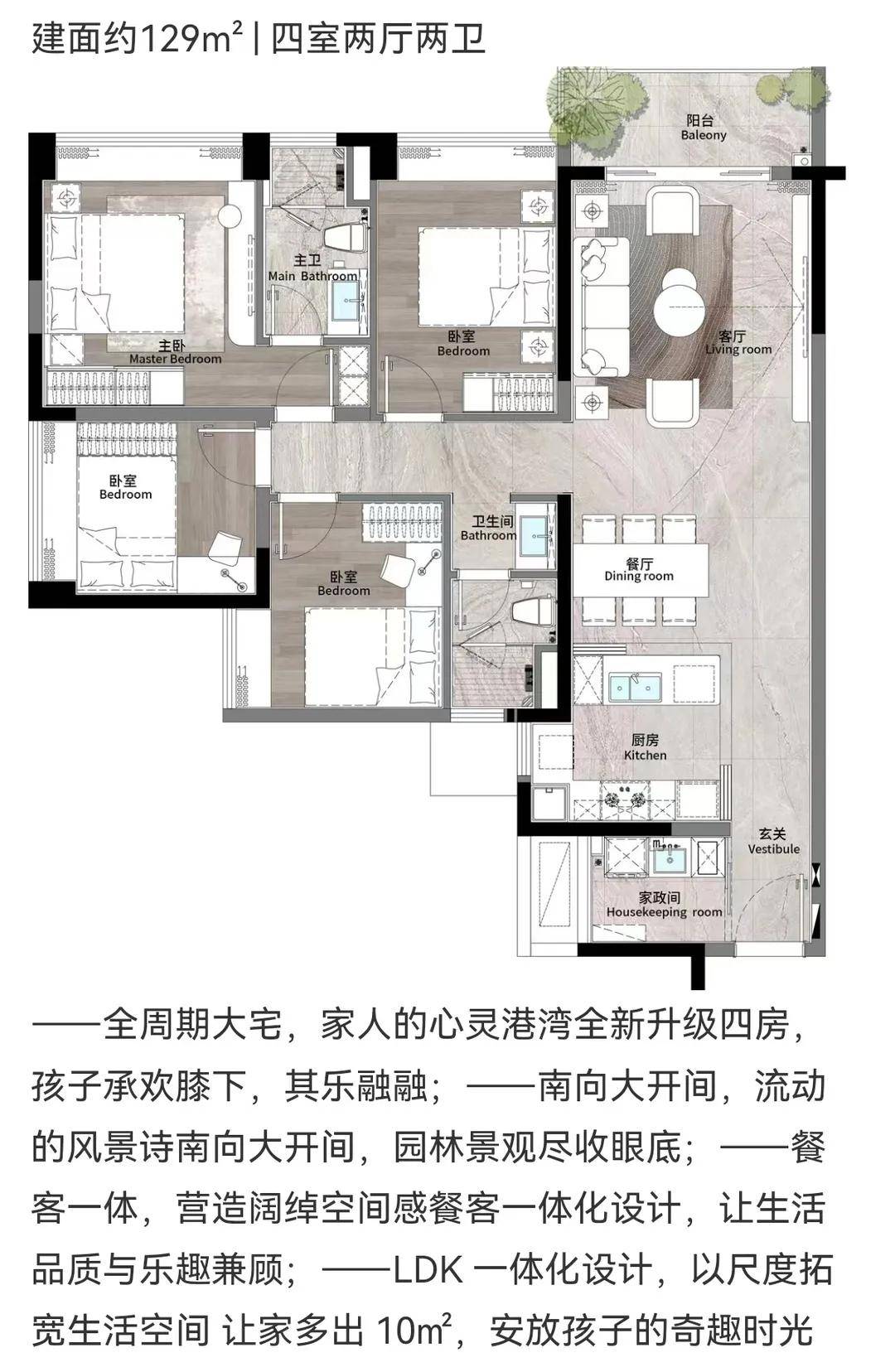 丨户型革新·金融城头等舱的空间美学【建面约129㎡四房】四开间朝南,采用LDKB一体化设计,主卧270°转角飘窗