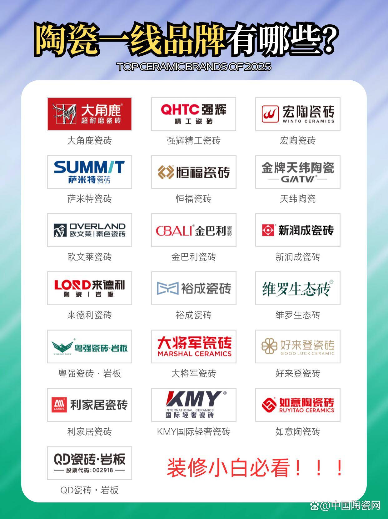 2025陶瓷一线品牌名单如下:大角鹿瓷砖、萨米特瓷砖、欧文莱素色瓷砖、来德利陶瓷丨岩板、粤强瓷砖·岩板、利家居瓷砖·岩板、QD瓷砖、新润成瓷砖、如意陶瓷砖、维罗生态砖、恒福瓷砖、金巴利瓷砖、裕成瓷砖、好来登瓷砖、大将军瓷砖、KMY国际轻奢瓷砖、强辉精工瓷砖、宏陶瓷砖、天纬陶瓷。