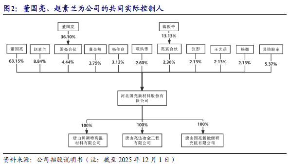 截至2025年12月1日,董国亮直接持有公司股份41,419,206股,占公司股本总额的比例为63.15%,通过国亮合伙间接控制公司4.44%的表决权;赵素兰直接持有公司股份5,799,330股,占公司股本总额的比例为8.84%;董国亮、赵素兰之子董金峰直接持有公司2,485,427股,占公司股本总额的比例为3.79%。国亮合伙、董金峰为董国亮、赵素兰的一致行动人。董国亮、赵素兰合计控制公司80.22%的表决权。董国亮与赵素兰为夫妻关系,其中董国亮担任公司董事长,赵素兰担任公司董事。董国亮、赵素兰能够对公司股东会、董事会及经营决策产生重大影响,为公司的共同实际控制人。