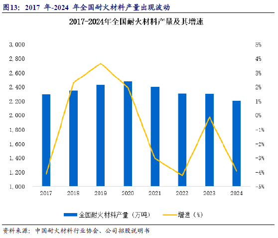 2.1、2017-2024年全国耐火材料产量波动,绿色节能材料是行业发展方向