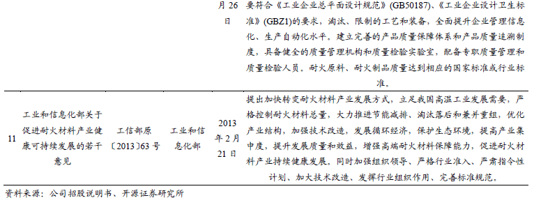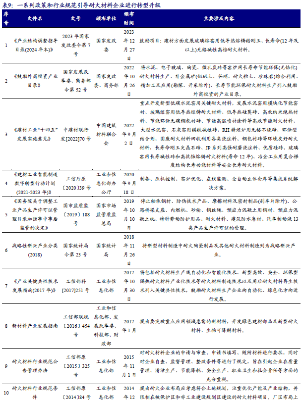 钢铁、水泥、玻璃和陶瓷等行业碳排放占我国碳排放比重较大,随着“碳达峰、碳中和”政策的实施,钢铁、水泥、玻璃和陶瓷等行业将积极推进绿色高质量发展,加强节能减排。国家发改委、商务部发布的《鼓励外商投资产业目录》(2022年版本),将水泥、电子玻璃、陶瓷、微孔炭砖等窑炉用长寿命节能环保(无铬化)耐火材料生产列为《全国鼓励外商投资产业目录》,将长寿节能环保耐火材料生产列入《中西部地区外商投资优势产业目录》。耐火材料作为高温工业的重要基础和支撑材料,将朝长寿命、节能、绿色方向发展。