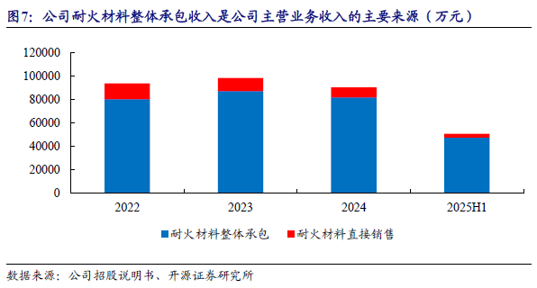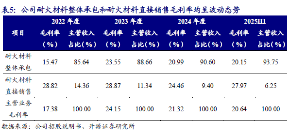 耐火材料整体承包的业务模式是制造业与服务业融合发展的新型制造模式和产业形态,是先进制造业和现代服务业深度融合的重要方向。2022-2025H1,公司为钢铁冶炼企业提供耐火材料整体解决方案,即根据客户需要,集成热工装备用耐火材料的配置设计研发、生产制造、安装施工、使用维护、技术服务和用后处理等工序的一体化服务模式。公司是业内知名企业,以优质的产品及服务、成熟的方案、丰富的行业经验赢得众多客户的青睐。耐火材料整体承包模式下,公司根据耐火材料使用环境,研究耐火材料损毁机制,针对具体使用部位,选择和应用适宜材质的耐火材料。此外,公司持续对耐火材料产品进行技术升级,通过提升耐火材料产品性能,有效延长钢包、中间包、铁水包的使用寿命,降低客户吨钢耐火材料消耗,实现与客户共赢。