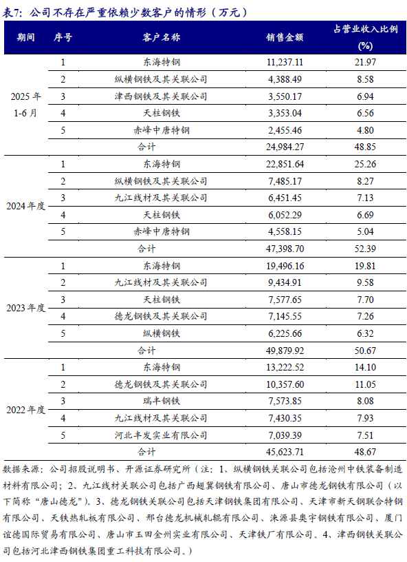 公司为德龙钢铁、东海特钢、天柱钢铁、津西钢铁、燕山钢铁、纵横钢铁、九江线材、首钢集团、东华钢铁、瑞丰钢铁、冀南钢铁、鑫达钢铁、河钢股份等多家知名钢厂提供耐火材料整体承包服务,拥有20多年的整体承包服务经验。2022-2025H1,公司不存在向单个客户的销售比例超过50%或严重依赖少数客户的情形。