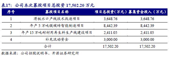 本次公开发行股票所募集的资金在扣除发行费用后的净额,公司将投资于“滑板水口产线技术改造项目”、“年产5万吨镁碳砖智能制造项目”、“年产15万吨耐材用再生料生产线建设项目”以及补充流动资金。