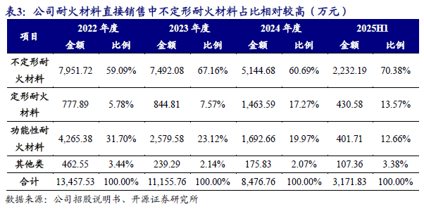 2022-2025H1,公司耐火材料直接销售中细分产品收入构成情况如下表所示。