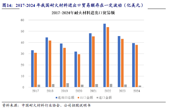从耐火材料进出口贸易额情况来看,我国以出口贸易为主,进口贸易占比较小。2024年我国耐火材料进出口贸易总额达39.44亿美元,其中出口贸易额高达37.84亿美元,同比下降12.33%。从整体来看,近年来由于耐火材料售价波动较大,加之国内外复杂形势的影响,进出口贸易额会存在一定的波动。