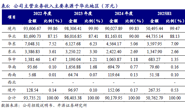 公司境内业务主要集中在华北地区,其他地区销售规模较小。2022年、2023年和2024年公司在华北地区市场占有率分别为4.69%、4.62%和4.83%,公司在其他地区的市场占有率均低于1%,未来仍有较大的发展空间。