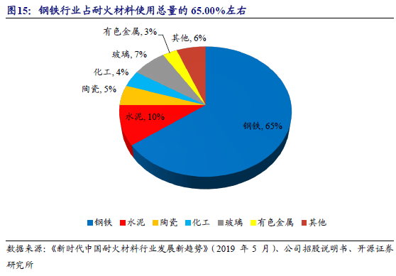 从耐火行业下游来看,耐火材料广泛应用于钢铁、水泥、陶瓷、玻璃、化工、有色等高温工业相关领域。钢铁行业占耐火材料使用总量的65.00%左右。由于炼钢所有环节都需要耐火材料,且个别环节对耐火材料消耗侵蚀严重,更换速度快,因而钢铁行业对耐火材料需求最多。