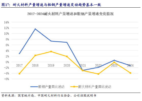钢铁行业对于耐火材料行业的发展具有举足轻重的作用,因此,耐火材料行业受下游钢铁行业的影响,耐火材料产量增速与粗钢产量增速变动趋势基本一致。