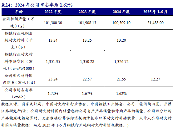 根据公司测算,2022年-2024年钢铁行业耐火材料市场空间分别为1,351.35万吨、1,350.28万吨和1,326.72万吨,耐火材料行业持续进行技术创新,随着长寿命、高性能耐火材料的使用,钢铁行业粗钢生产过程中吨钢耐火材料消耗量整体呈下降趋势,市场空间略有下降。2022年、2023年和2024年公司耐火材料产品在钢铁行业用耐火材料市场占有率分别为1.72%、1.67%和1.62%,2023年度和2024年度同比下降0.05个百分点。