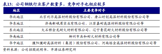 公司下游客户是钢铁生产企业,钢厂通常采用招投标的方式确定供应商,根据耐火材料使用的具体环节如钢包、中间包、铁水包等分段进行招标,出于保障生产的需要,客户通常选取至少2名供应商进行合作,部分钢厂有多个生产车间,存在按车间单独进行招投标的情形,与钢厂合作的耐火材料供应商数量较多。公司钢铁行业客户数量多,竞争对手也相应较多。