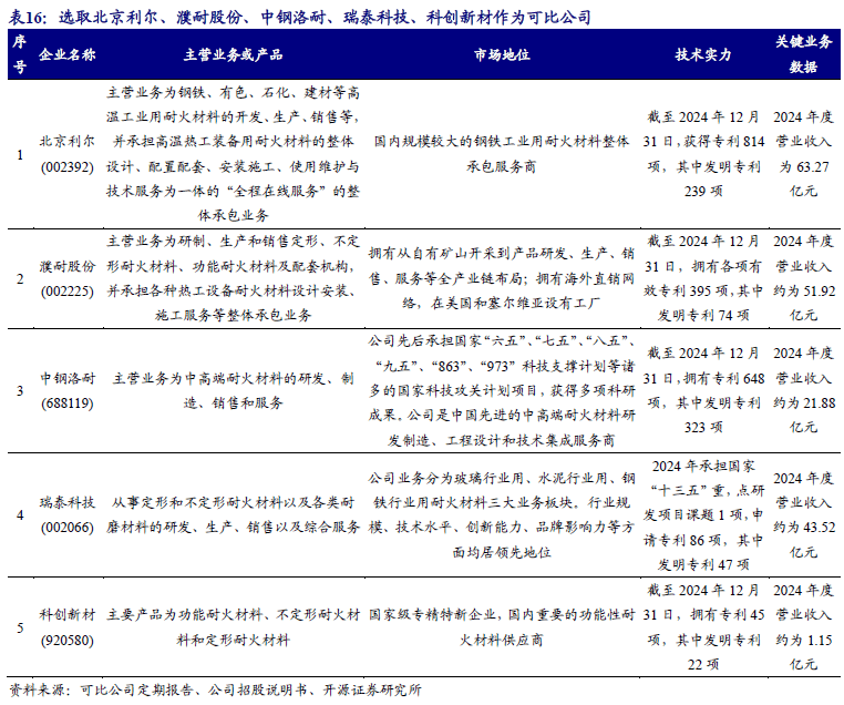 我们选取与公司产品同类或部分同类,应用场景相同或相近,且具有一定市场影响力的代表性企业作为同行业可比公司。综合考虑,选取北京利尔、濮耐股份、中钢洛耐、瑞泰科技、科创新材作为可比公司。