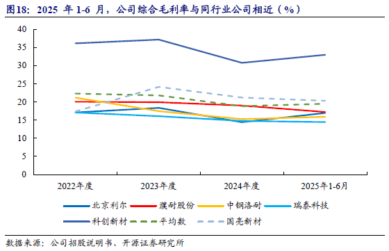 2022-2025H1,公司综合毛利率分别为17.38%、24.15%、21.21%和20.33%。2024年度,公司综合毛利率高于同行业可比公司平均水平,但变动趋势保持一致,均有所下滑,主要原因包括:一方面,受下游钢铁行业市场低迷的影响,各类耐火材料产品及服务的销售(结算)价格整体有一定程度的下降;另一方面,镁砂、刚玉等原材料市场价格呈上升趋势,综合因素导致耐火材料行业毛利率水平有所下降。2025年1-6月,公司综合毛利率与同行业公司相近。