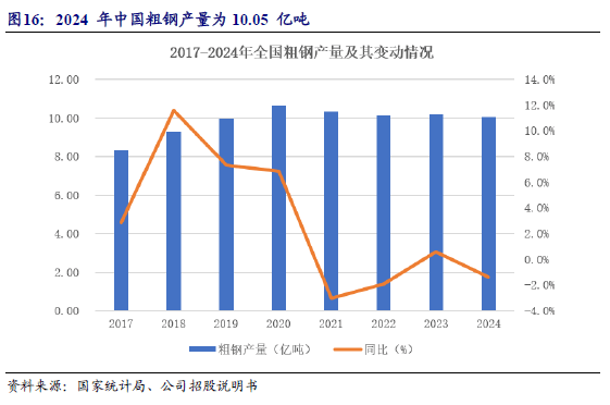 2024年以来,制造业用钢需求上升,但受房地产市场低迷的影响,房地产用钢需求下降。近期国家出台一系列政策支持地产发展,中央提出房地产市场止跌回稳,预计未来房地产对钢铁消费的不利影响将减弱。根据国家统计局数据,2025年1季度,我国粗钢产量25,933万吨,同比增长0.6%。