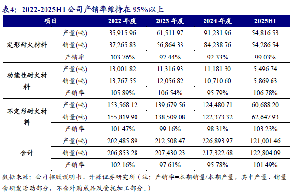 耐火材料能够提升冶炼设备使用寿命、降低能源消耗水平、提升冶炼产品的品质等。2022-2025H1,公司生产多种定形、不定形和功能性耐火材料产品。公司生产的耐火材料产品除部分直接对外销售外,大多用于公司耐火材料整体承包服务。作为耐火材料制造企业,公司生产的耐火材料如下表所示。